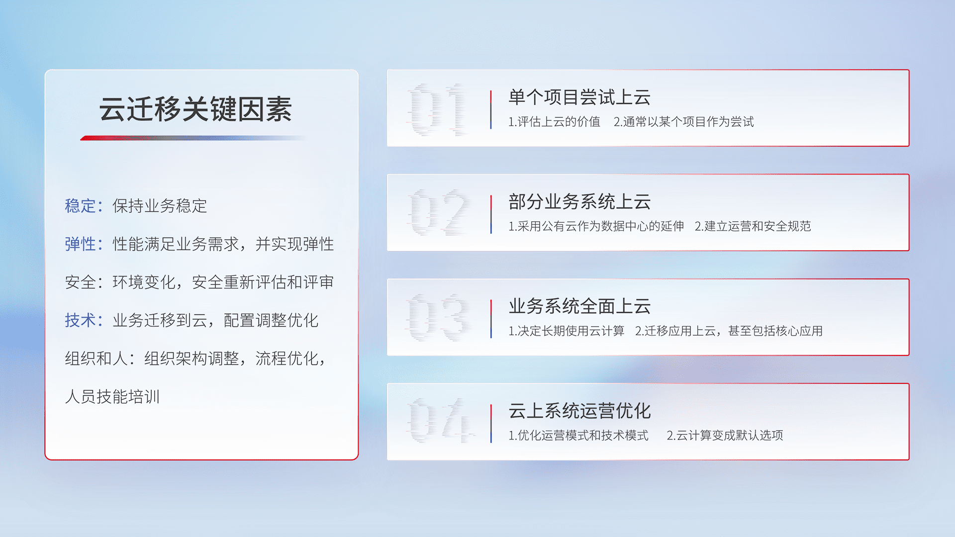 结合实际业务,,从规划设计、、、、云平台选型、、云原生改造、、、、数据迁移、、、集成交付,,,,迁移全过程为客户识别最佳上云路径,,做好风险识别管理,,设计网络架构、、、、身份权限、、、、安全审计合规、、操作审计、、日志审计、、、监控告警策略、、、多站点容灾设计等,,对云上基础设施进行整体规划,,提升IT治理水平,,,以满足弹性、、、、高可用、、、高性能的需求。。。